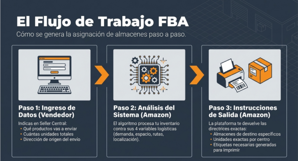 En Amazon, no es el vendedor quien decide el almacén de destino. Es la propia plataforma la que asigna automáticamente el centro logístico al que debe enviarse cada producto.